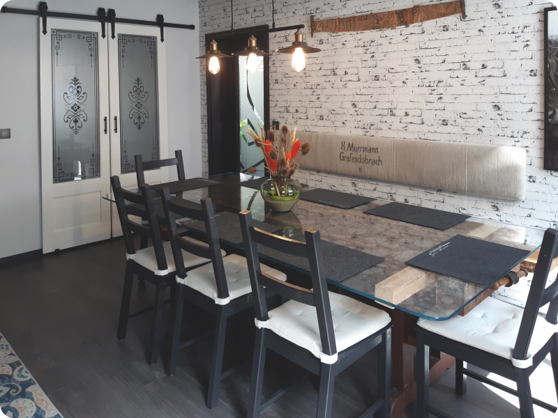 Das einladend gestaltete Esszimmer mit rustikaler Holzbalkendecke ist der zentrale Treffpunkt für gemeinsame Mahlzeiten, gesellige Abende und fröhliche Spielrunden.